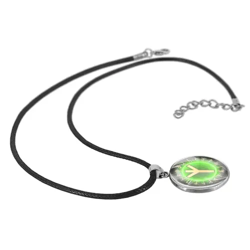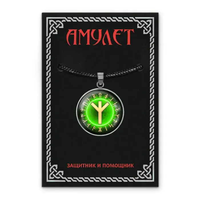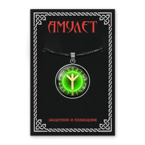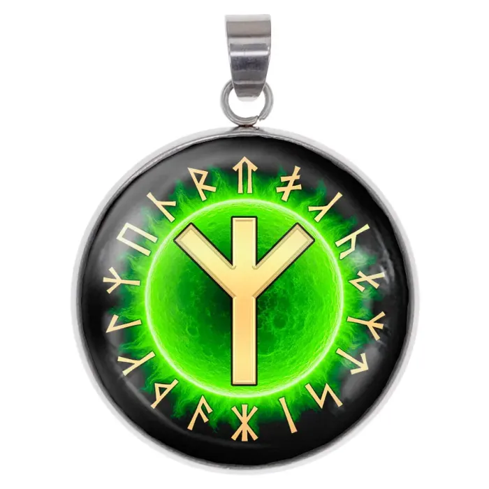 Кулон-амулет из нержавеющей стали с изображением руны под выпуклой стеклянной линзой.