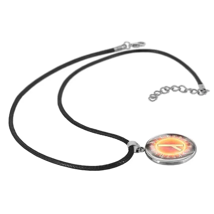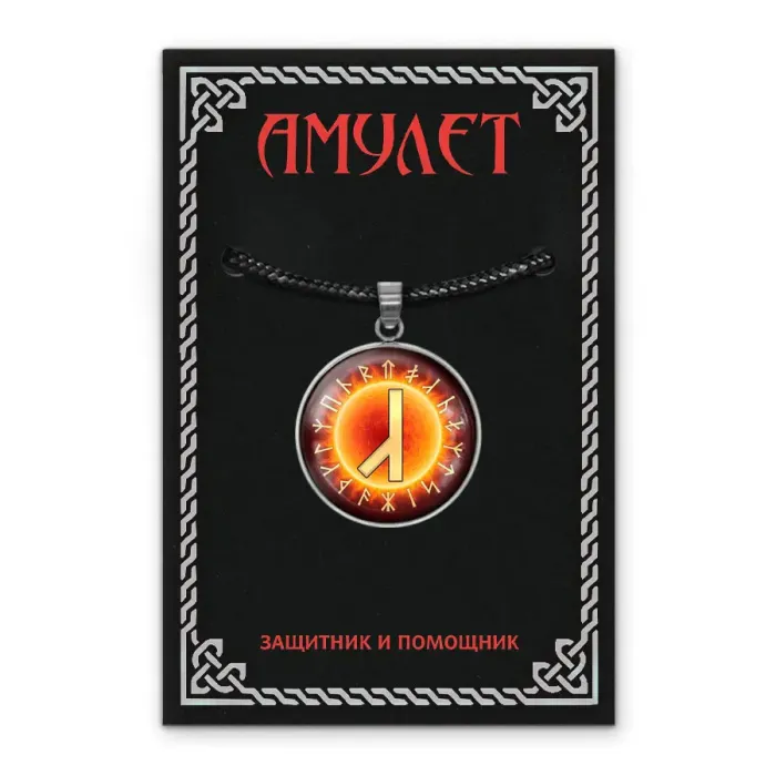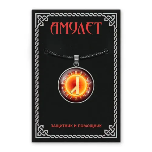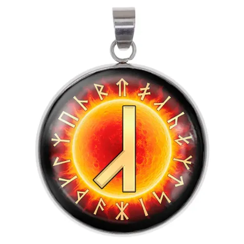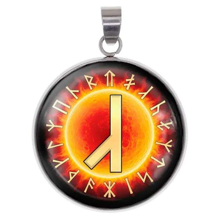 Кулон-амулет из нержавеющей стали с изображением славянской руны Алатырь под выпуклой стеклянной линзой.