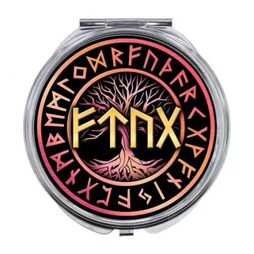 Складное зеркало для личного использования, изготовленное из металла и стекла. Украшено изображением рунической формулы.