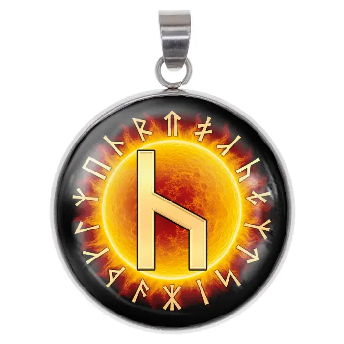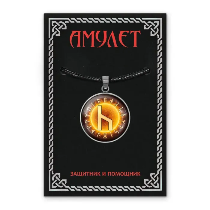 Кулон-амулет из нержавеющей стали с изображением славянской руны под выпуклой стеклянной линзой.