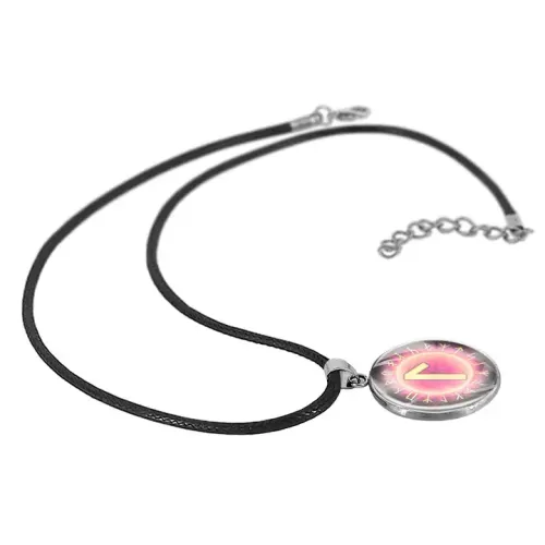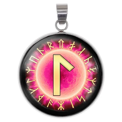Кулон-амулет из нержавеющей стали с изображением славянской руны под выпуклой стеклянной линзой.