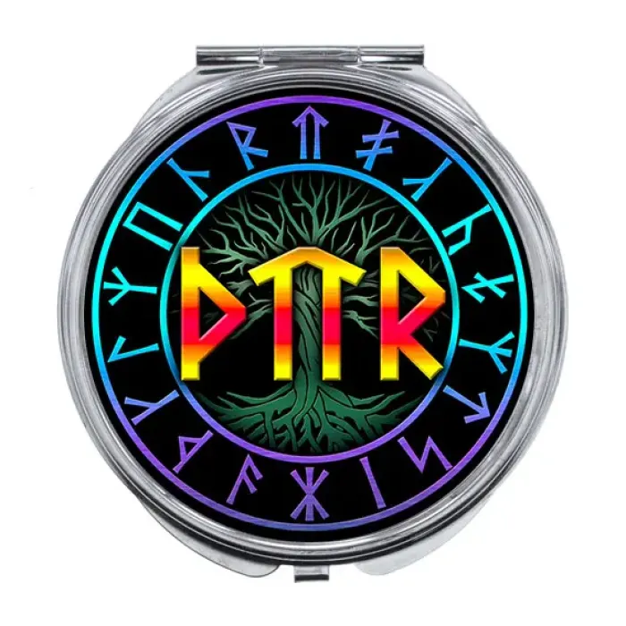Складное зеркало из металла с печатью славянской рунической формулы.