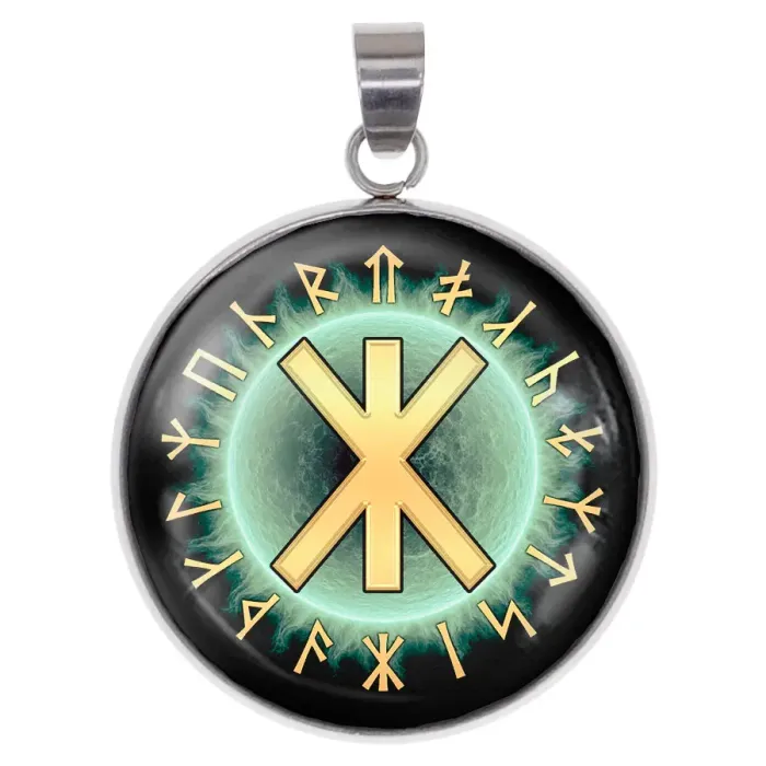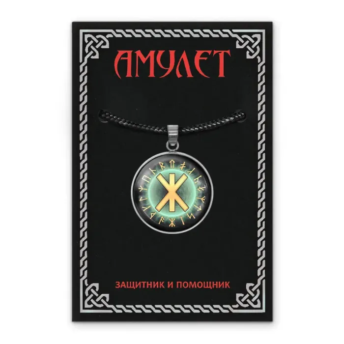 Кулон-амулет из нержавеющей стали с изображением славянской руны под выпуклой стеклянной линзой.