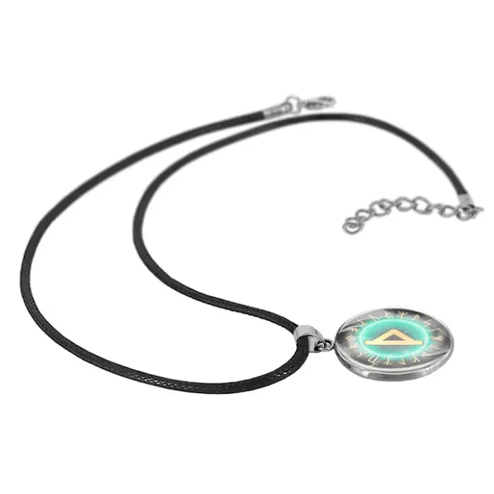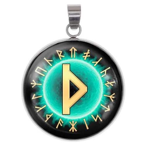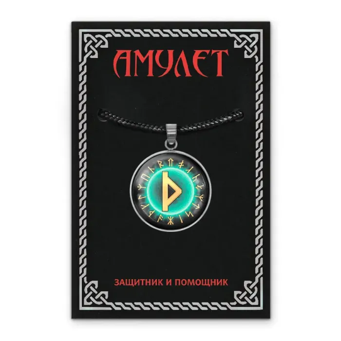 Кулон-амулет из нержавеющей стали с изображением славянской руны под стеклянной линзой.