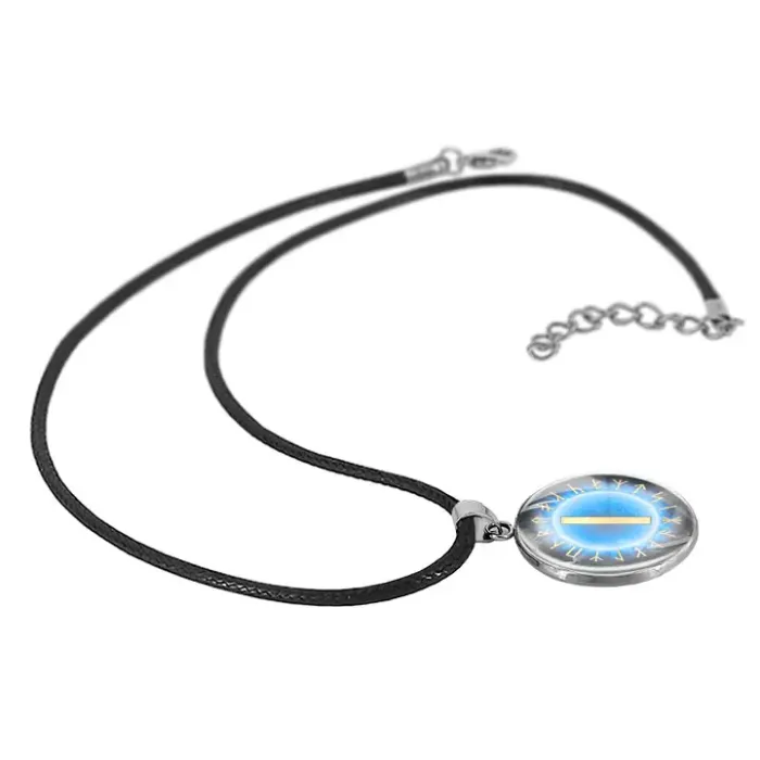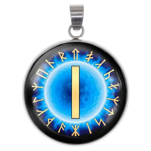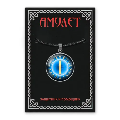 Кулон-амулет из нержавеющей стали с изображением славянской руны под защитной стеклянной линзой.