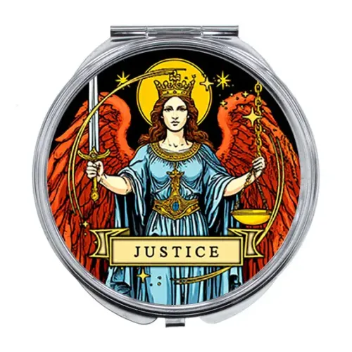 Складное зеркало с изображением печати Таро «Справедливость». Изготовлено из металла и стекла.