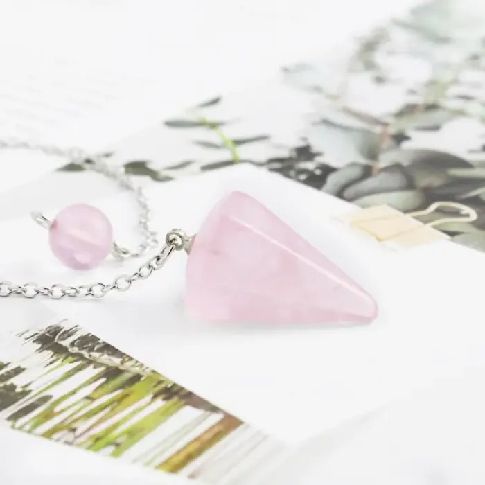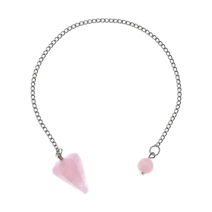 Маятник для биолокации из натурального розового кварца и металла с серебристым покрытием.
