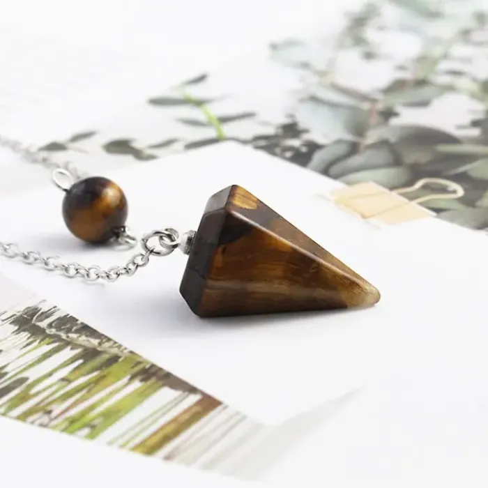 Маятник для биолокации из натурального камня тигровый глаз с металлическим подвесом.