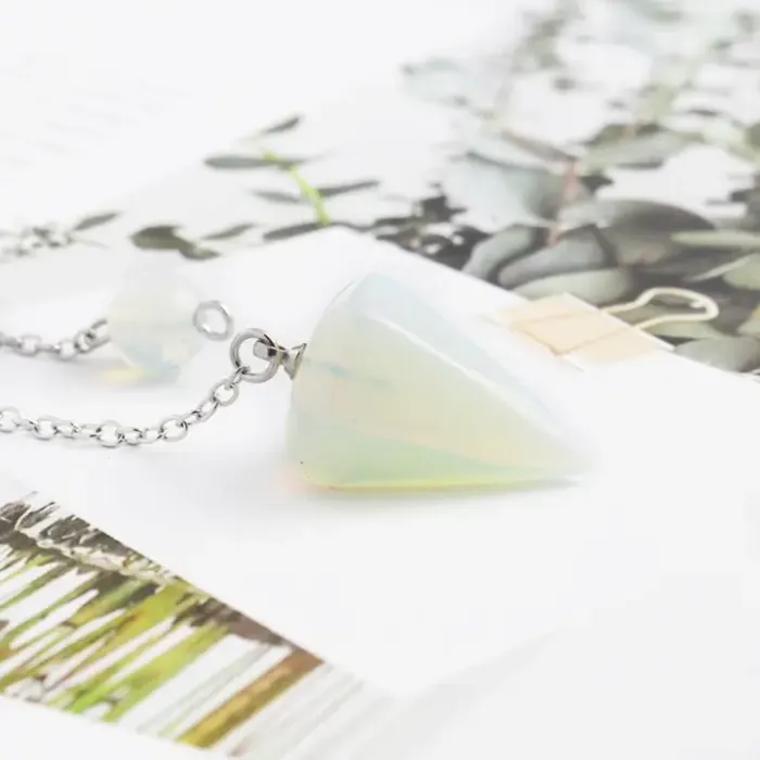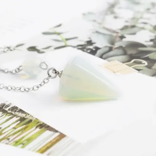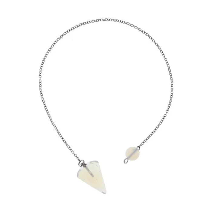 Маятник для биолокации длиной 23 см выполнен из синтетического лунного камня и металла с серебристым покрытием.