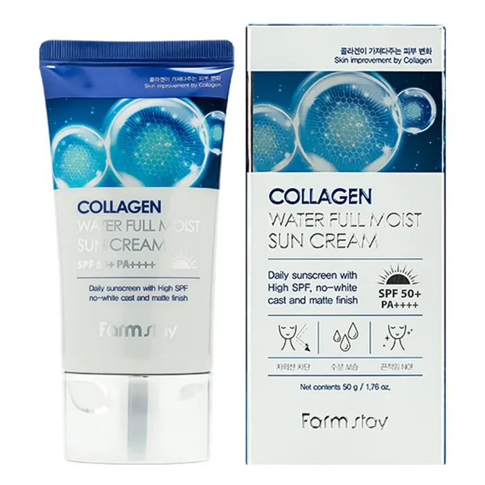 Солнцезащитный крем с коллагеном Collagen Water Full Moist Sun Cream SPF50+/PA++++ от FarmStay обеспечивает надежную защиту от солнечных лучей, одновременно увлажняя и омолаживая кожу. Благодаря высокому уровню защиты SPF50+/PA++++, крем эффективно предотвращает воздействие ультрафиолетовых лучей. Коллаген в составе способствует улучшению эластичности кожи, выравниванию тона и разглаживанию морщин за счет удержания влаги.