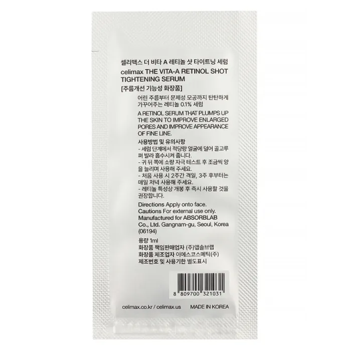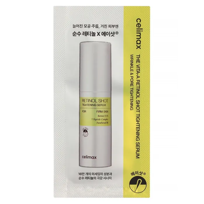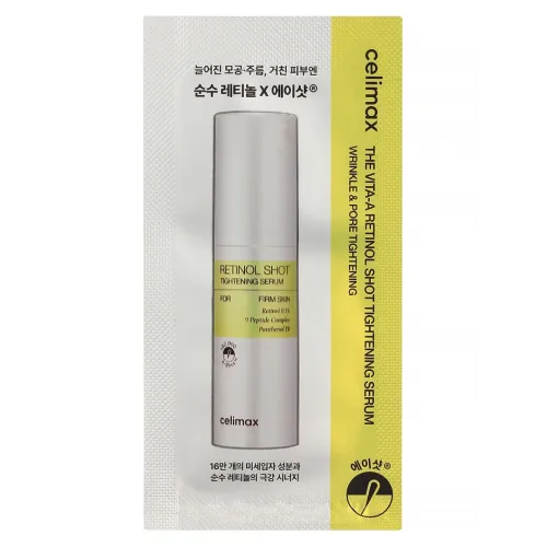 Сыворотка CELIMAX THE VITA-A RETINOL SHOT TIGHTENING SERUM предназначена для повышения упругости кожи и обладает мощным подтягивающим эффектом. Формула продукта обогащена 162 000 микрочастиц A-shot, ретинолом и пептидным комплексом, которые стимулируют клеточное обновление. Это способствует уменьшению морщин, носогубных складок и пор. Высококонцентрированная сыворотка обеспечивает легкое увлажнение и придаёт коже сияние.