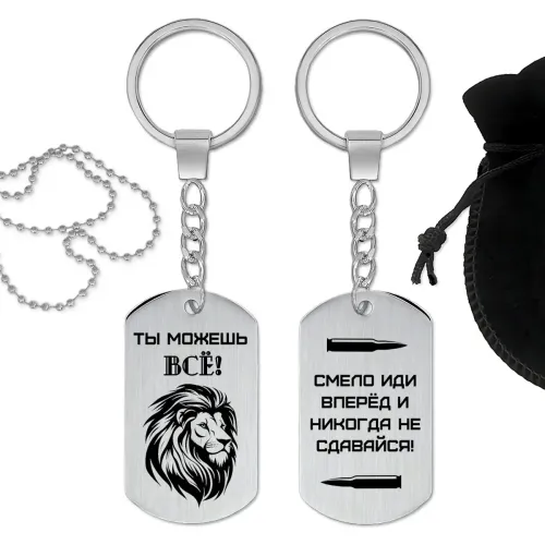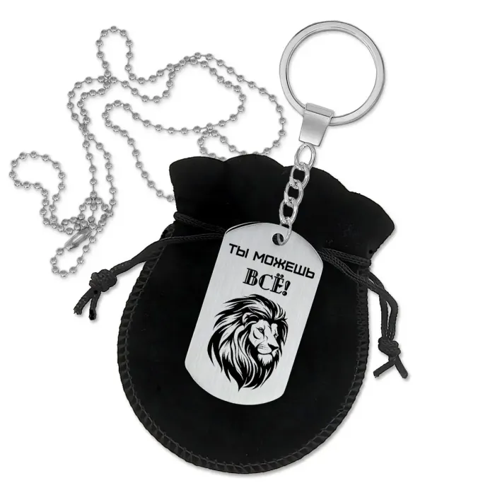 Размеры и комплектация: Размер жетона 50х28 мм. В комплекте кольцо для ключей, шариковая цепочка, бархатный мешочек. Упаковка — прозрачный пакет.
