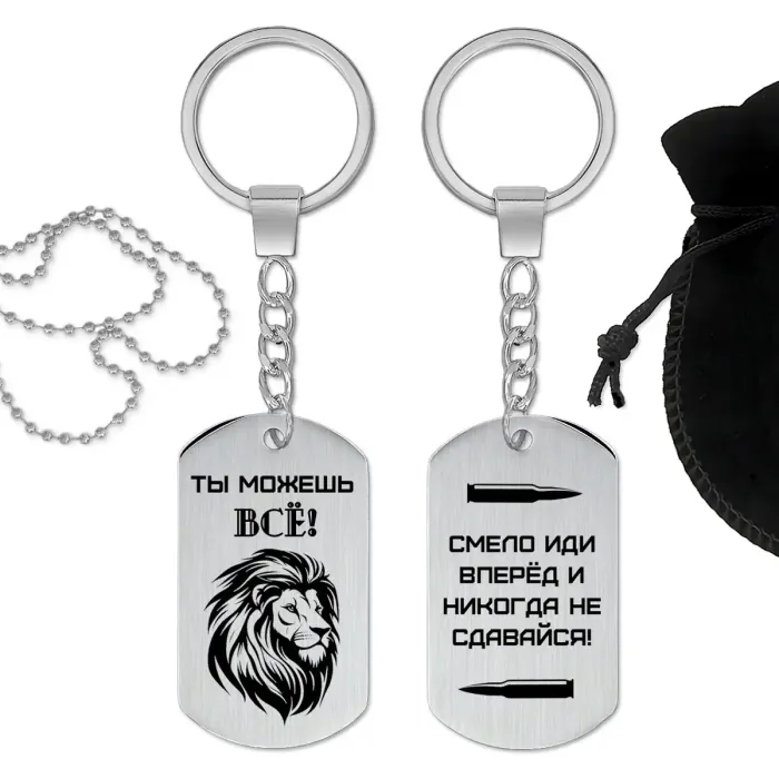 Двусторонний брелок-кулон из нержавеющей стали с гравировкой надписи.