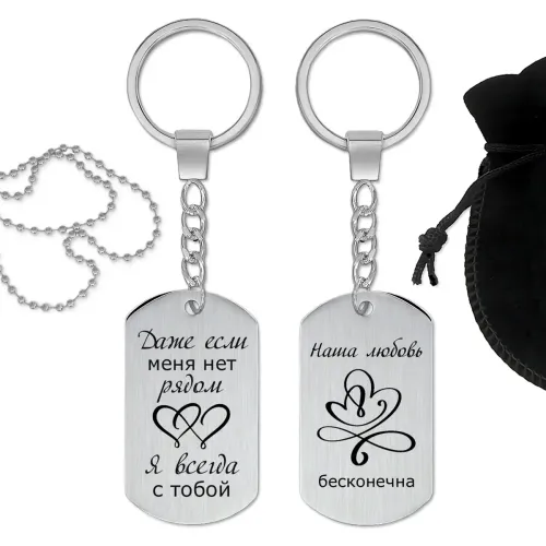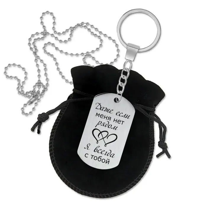 Размеры и комплектация: Размер жетона 50х28 мм. В комплекте кольцо для ключей на цепочке, шариковая цепочка, бархатный черный мешочек. Упаковка — прозрачный пакет.