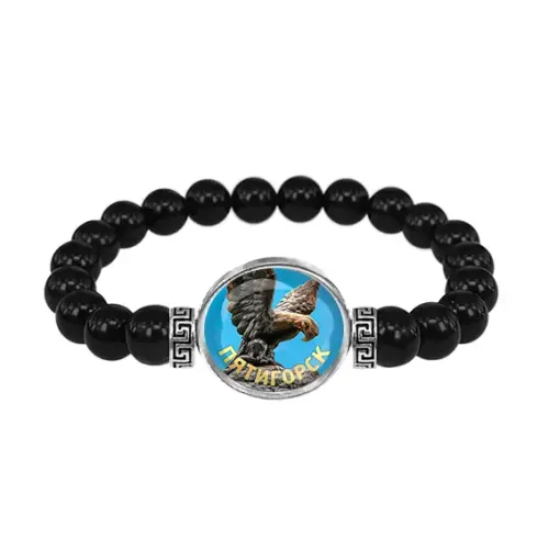 Материал и изготовление: Натуральный черный агат (бусины диаметром 8 мм). Декоративный элемент с изображением диаметром 20 мм расположен под выпуклой стеклянной линзой на сеттинге из бижутерного сплава с покрытием под серебро.