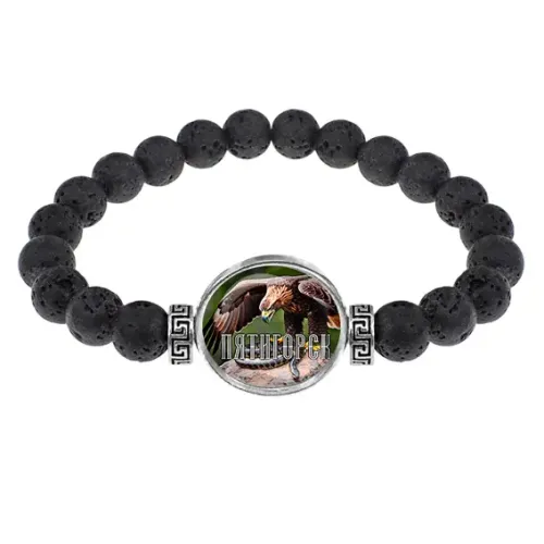 Стрейч-браслет из натуральной лавы диаметром 8 мм с изображением под выпуклой стеклянной линзой. Внутренний диаметр составляет около 5,5 см. Изготовлен из лавы, бижутерного сплава с покрытием под серебро и стекла. Натуральный камень лава ценится за свою способность впитывать эфирные масла, что делает его идеальным для аромабижутерии. Нанесение нескольких капель эфирного масла на бусины позволяет создать уникальные ароматические композиции и наслаждаться их эффектом в течение дня.