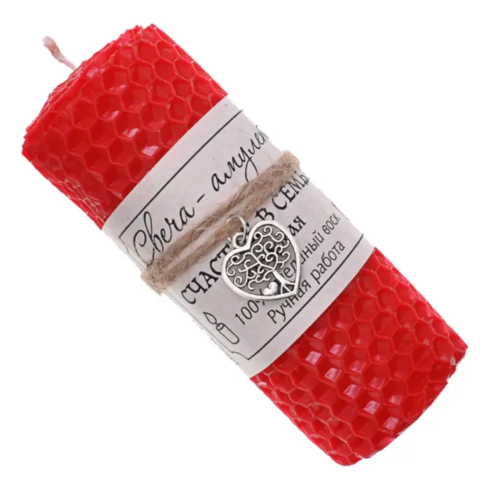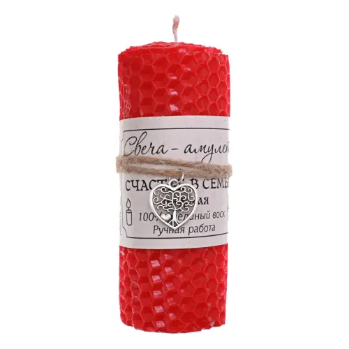 Свеча из пчелиного воска ручной работы, выполненная в красном цвете.