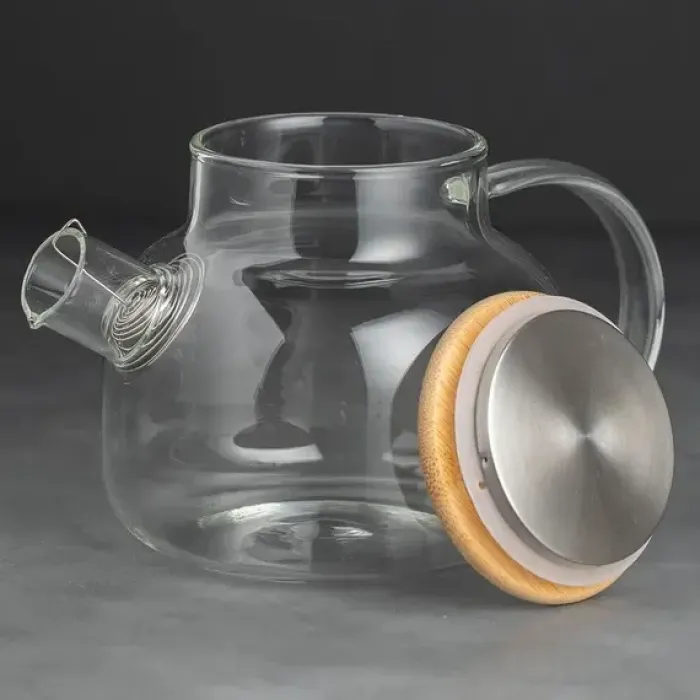 Прозрачные стенки из жаропрочного стекла позволяют контролировать крепость настоя. Чайник можно сочетать с чашками из стекла или керамики. Форма груши делает его подходящим элементом для кухонь в современных стилях.