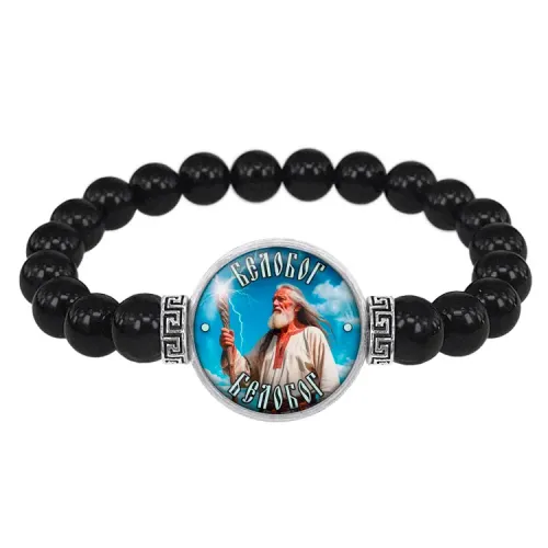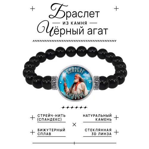 Стрейч-браслет амулет Славянские боги Белобог — это стильный аксессуар, который сочетает в себе красоту и символику. Изготовленный из бусин чёрного агата диаметром 8 мм, он украшен изображением диаметром 20 мм под выпуклой стеклянной линзой. Браслет упакован в прозрачный полипропиленовый пакетик без подвеса, что делает его удобным для подарка или личного использования.