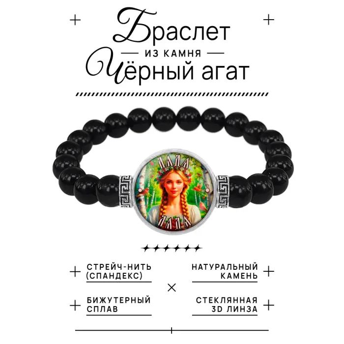 Стрейч-браслет-амулет 'Славянские боги Лада' выполнен из бусин черного агата диаметром 8 мм, с изображением под выпуклой стеклянной линзой диаметром 20 мм. Этот уникальный аксессуар не только украшает, но и несет в себе глубокий символизм. Черный агат традиционно используется для поглощения негативной энергии и привлечения финансового успеха. Он помогает наладить личную жизнь, защищает от зависти и недоброжелателей, укрепляя энергетическую защиту. Внутренний диаметр браслета составляет примерно 5,5 см, а материалы включают камень, бижутерный сплав с покрытием под серебро и стекло. Упакован в прозрачный полипропиленовый пакетик без подвеса.