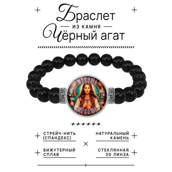 Стрейч-браслет амулет "Славянские боги Мокошь" — это уникальное украшение, которое сочетает в себе стиль и символику. Изготовленный из бусин черного агата диаметром 8 мм, он дополнен изображением диаметром 20 мм под выпуклой стеклянной линзой. Браслет упакован в прозрачный полипропиленовый пакетик без подвеса, что делает его идеальным для подарка или личного использования.