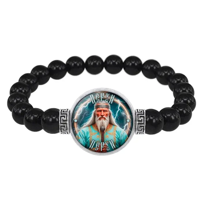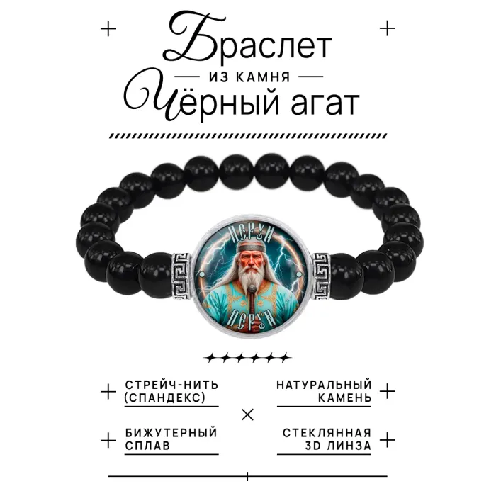 Стрейч-браслет амулет Славянские боги Перун — это уникальный аксессуар, который сочетает в себе красоту и защитные свойства. Изготовленный из бусин чёрного агата диаметром 8 мм, он украшен изображением диаметром 20 мм под выпуклой стеклянной линзой. Браслет упакован в прозрачный полипропиленовый пакетик без подвеса, что делает его идеальным для подарка.