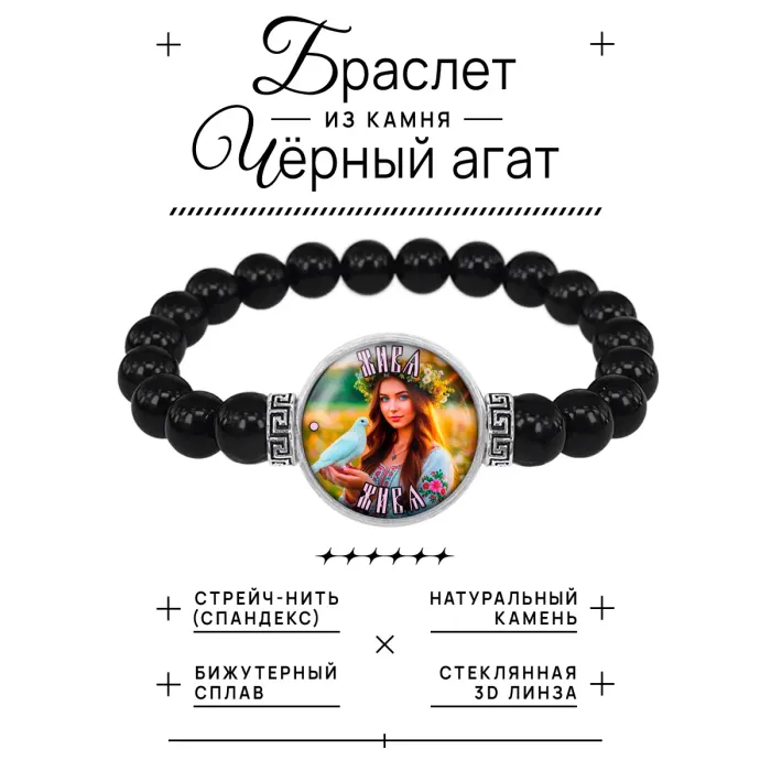 Размеры и комплектация: Диаметр бусин — 8 мм, диаметр линзы с изображением — 20 мм. Внутренний диаметр браслета — около 5,5 см. Упаковка — прозрачный полипропиленовый пакет.
