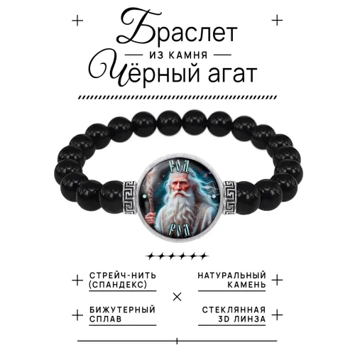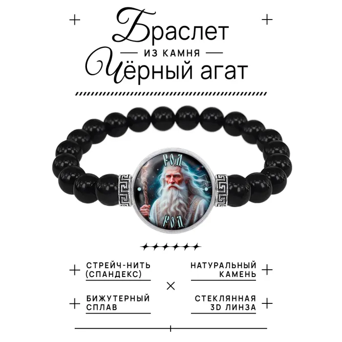 Стрейч-браслет амулет "Славянские боги Род" выполнен из бусин чёрного агата диаметром 8 мм и изображения диаметром 20 мм под выпуклой стеклянной линзой. Этот уникальный аксессуар не только дополняет образ, но и несёт в себе глубокий символический смысл, связанный с славянской культурой.