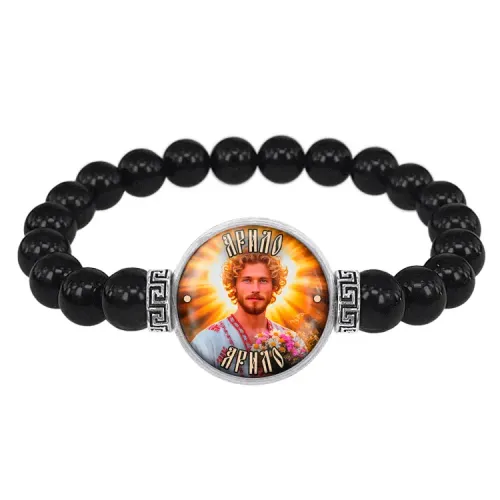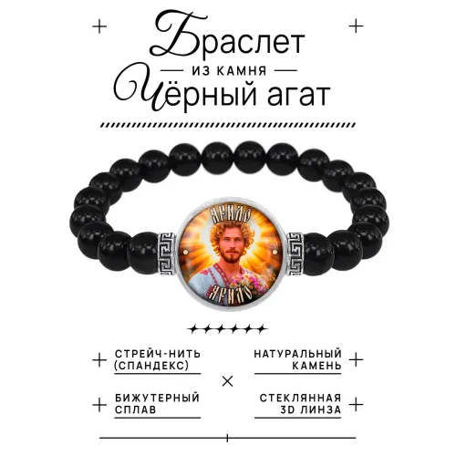 Стрейч-браслет амулет Славянские боги Ярило — это стильный аксессуар, который сочетает в себе красоту и символику. Изготовленный из бусин черного агата диаметром 8 мм, он украшен изображением диаметром 20 мм под выпуклой стеклянной линзой. Браслет упакован в прозрачный полипропиленовый пакетик без подвеса, что делает его идеальным для подарка или личного использования.