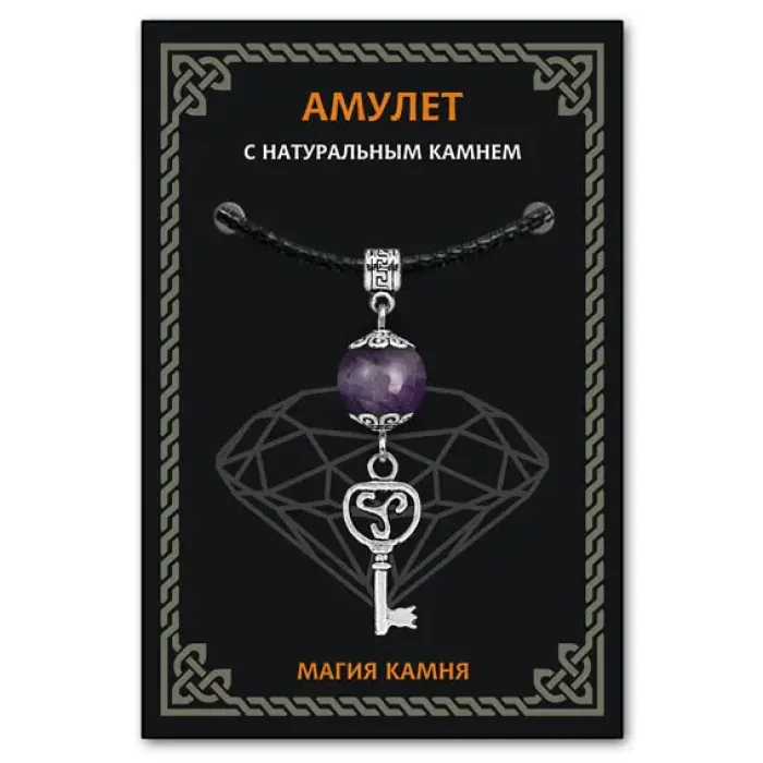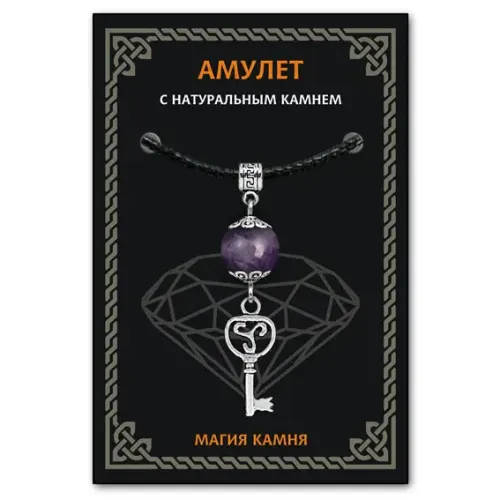 Амулет Ключ, выполненный из аметиста, символизирует мир, равновесие и гармонию. Этот уникальный амулет помогает в принятии решений в нестандартных ситуациях и защищает от конфликтов и негативных мыслей. Из коллекции Магия камня 2, он станет отличным подарком для тех, кто ценит силу натуральных камней. На обратной стороне вкладыша указано наименование камня, а также краткие описания значений всех камней и подвесок-талисманов. Амулет упакован в прозрачный полипропиленовый пакет с европодвесом и дополнен чёрным ХБ шнурком. Авторские права на дизайн защищены.