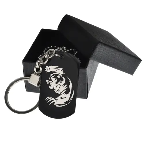 Именной жетон из нержавеющей стали с чернением и гравировкой изображения медведя.