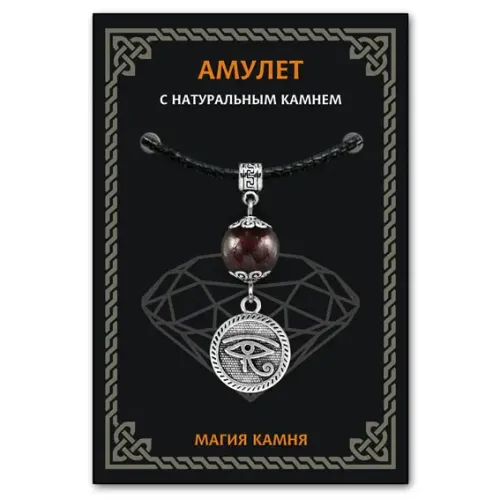 Амулет Око Ра, выполненный из граната, символизирует мощь и защиту. Гранат традиционно ценится за свою способность вдохновлять на творчество и страсть, а также способствует достижению целей и укреплению дружбы. Этот амулет не только украшает, но и служит защитой от врагов и измены. В комплекте с амулетом идет черный хлопковый шнурок для удобного ношения. Упакован в прозрачный полипропиленовый пакет с европодвесом, что делает его отличным вариантом для подарка. На обратной стороне вкладыша указано значение камня вместе с краткими описаниями всех камней коллекции Магия камня 2.