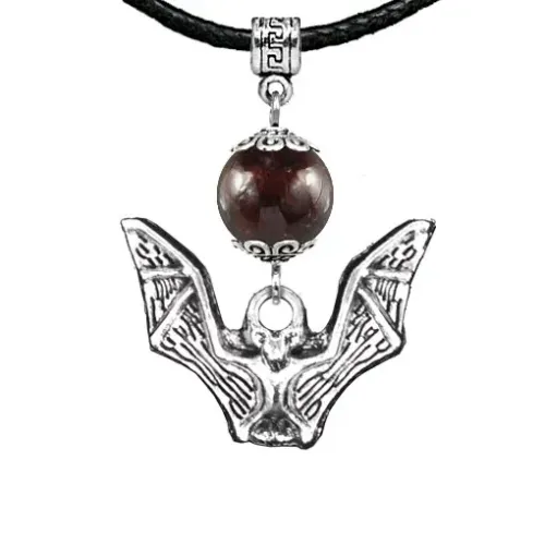 Амулет в виде летучей мыши из натурального граната, предназначенный для ношения на шнурке.