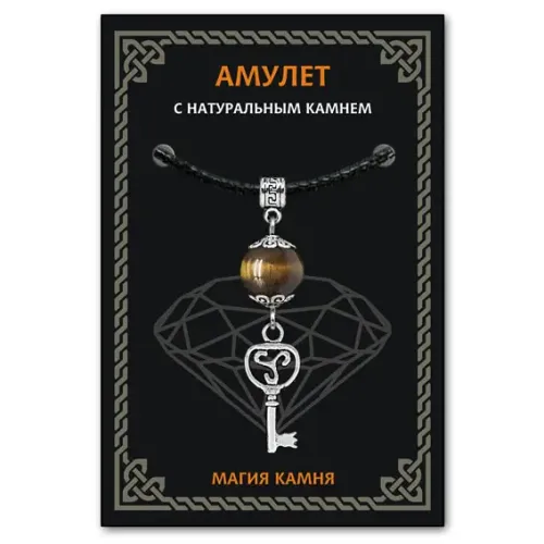 Амулет Ключ, выполненный из тигрового глаза, символизирует интуицию и смелость. Этот камень традиционно ценится за способность привлекать прибыль и способствовать возврату долгов, а также увеличивать доходы. Амулет защищает от негативных энергий, таких как вампиризм и ревность, помогая справляться со стрессом и болью.