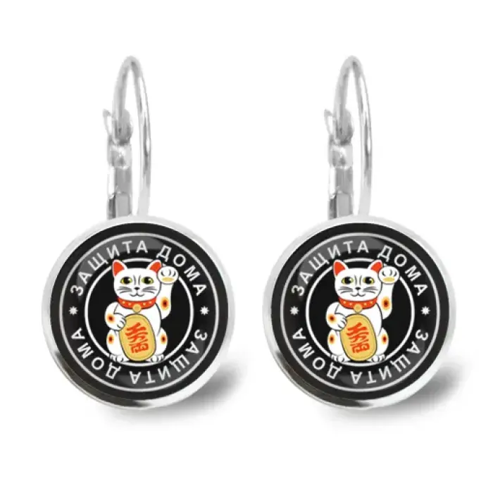 Серьги с изображением Манеки-Неко. Изготовлены из бижутерного сплава с выпуклыми стеклянными линзами.