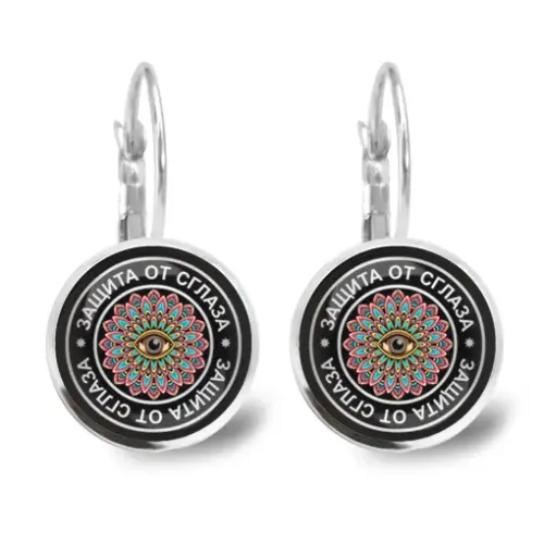 Серьги-сувенир из бижутерного сплава с символикой защиты от сглаза под выпуклыми стеклянными линзами.