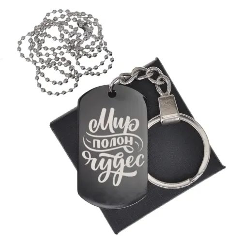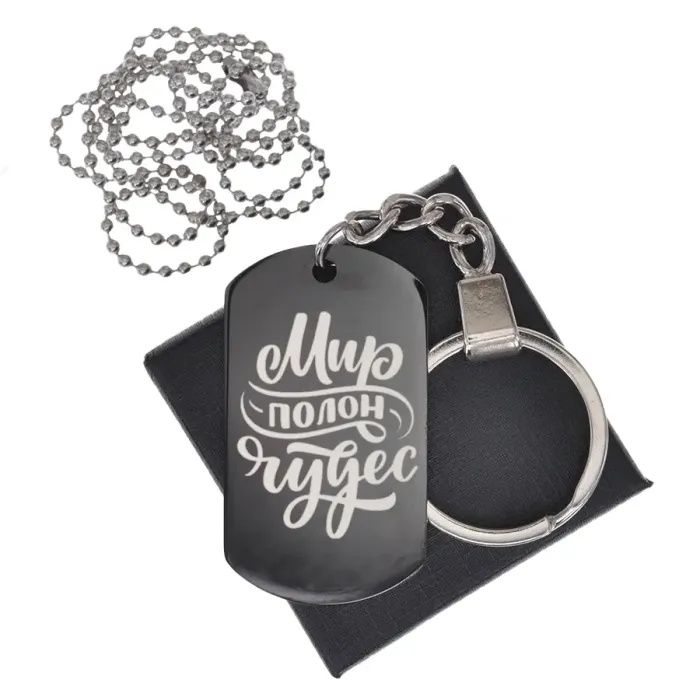 Размеры и комплектация: Размер жетона 49х28 мм. В комплект входит кольцо для ключей и шариковая цепочка с регулировкой длины. Упаковка — подарочная коробка.