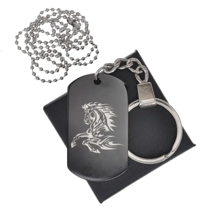 Размеры и комплектация: Размер 49х28 мм. Комплектуется кольцом для ключей и регулируемой шариковой цепочкой. Упаковка: подарочная коробка.