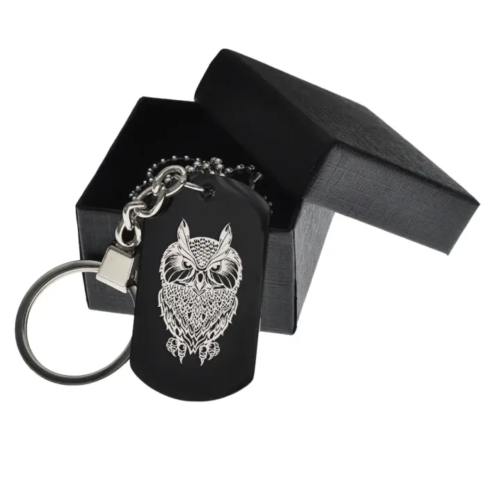 Сувенирный жетон из нержавеющей стали с чернением и гравировкой изображения совы.