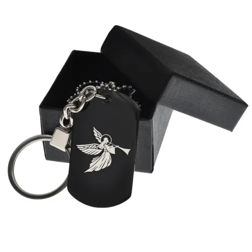 Жетон из нержавеющей стали с чернением и гравировкой изображения ангела с трубой.