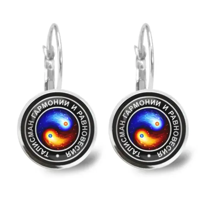 Серьги Инь-Ян из бижутерного сплава с покрытием под серебро и выпуклыми стеклянными линзами.