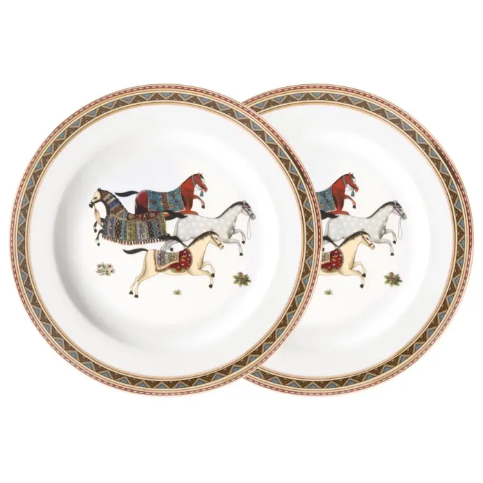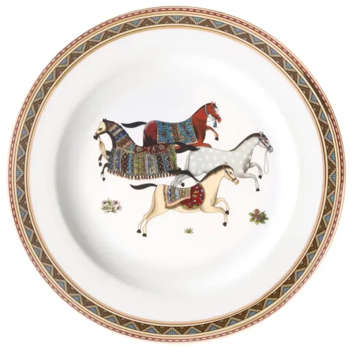 Тарелки выполнены из тонкостенного упрочнённого фарфора, что обеспечивает повышенную прочность. Поверхность украшена орнаментом и декоративной золотой окантовкой. Прямые формы и дизайн коллекции вдохновлены движениями лошадей. Посуда имеет сертификацию, подтверждающую безопасность контакта с пищевыми продуктами.