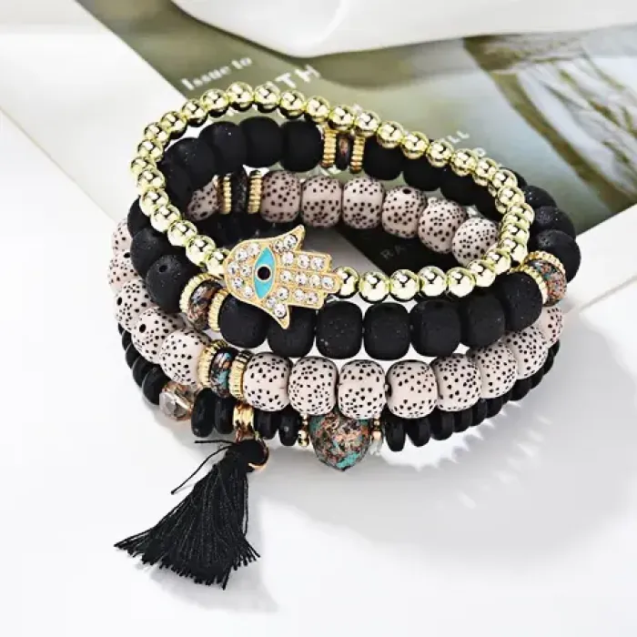 Набор из четырёх стрейч-браслетов. Материал: синтетический камень и металл. Дизайн включает символ Глаза Фатимы, кисточку и камни разных цветов.