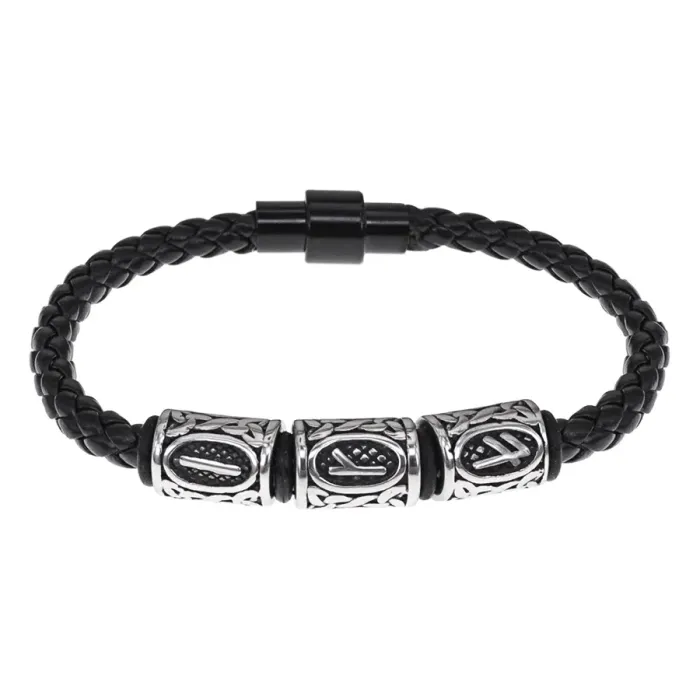 Браслет из натуральной кожи с бусинами из нержавеющей стали и рунической формулой.