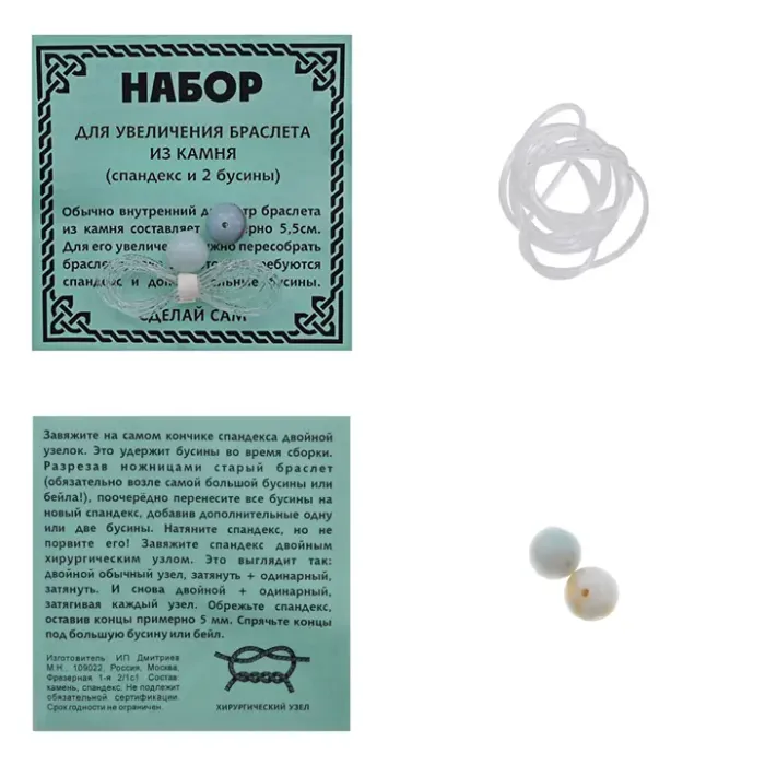 Размеры и комплектация: Диаметр бусин 8 мм, длина резинки (спандекс) 25 см. Упаковка: полипропиленовый пакет с подвесом. В комплекте инструкция.