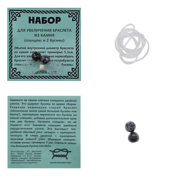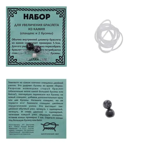Набор для изменения размера браслета, состоящий из резинки и двух бусин из обсидиана.
