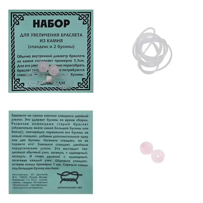 1. Комплект включает все необходимое для увеличения размера браслета: спандекс и две бусины.