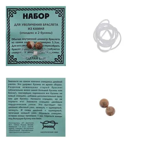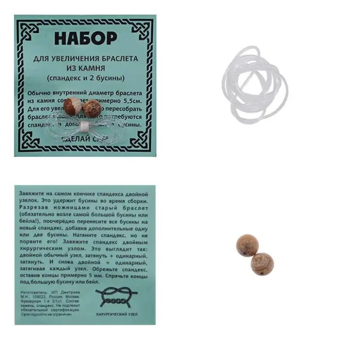 Размеры и комплектация: Две бусины диаметром 8 мм, спандекс длиной 25 см. Упаковка — полипропиленовый пакетик с подвесом. В комплекте инструкция.