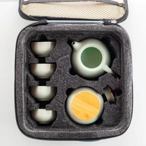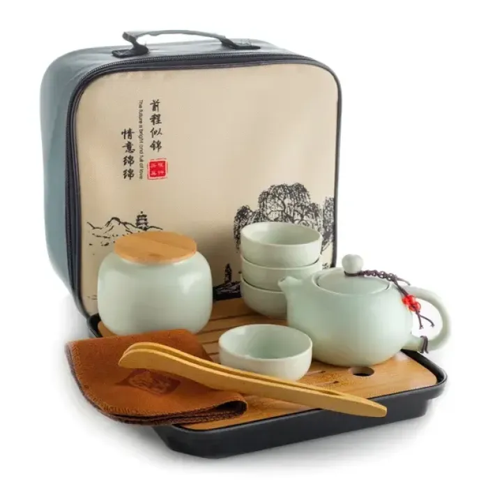 Керамический чайный сервиз светло-зеленого цвета предназначен для заваривания и подачи чая в дорожных условиях. Комплект поставляется в удобном чемоданчике для транспортировки. Основным материалом является высококачественная керамика с глазурью ручной работы.