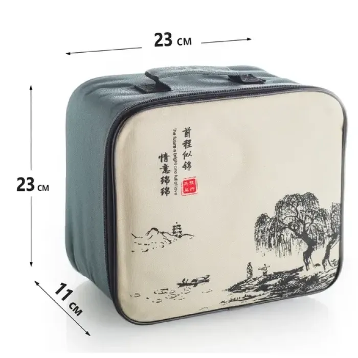 - Материал: керамика- Объем чайника: 180 мл- Объем пиал: 40 мл (каждая)- Объем чайницы: 220 мл- Количество предметов в наборе: чайник, 4 пиалы, чайница, чабань, салфетка, щипцы- Особенности: комплектация дорожным чемоданчиком